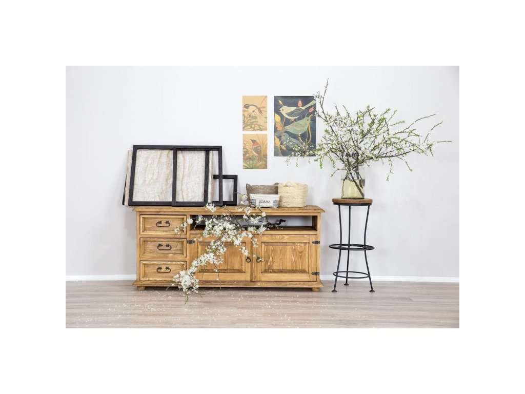 Televizní stolek POPRAD je zhotoven z masivní borovice a může být ošetřen voskem v barvě dle výběru. Díky stylovému kování působí tento nábytek elegantním a nadčasovým dojmem.